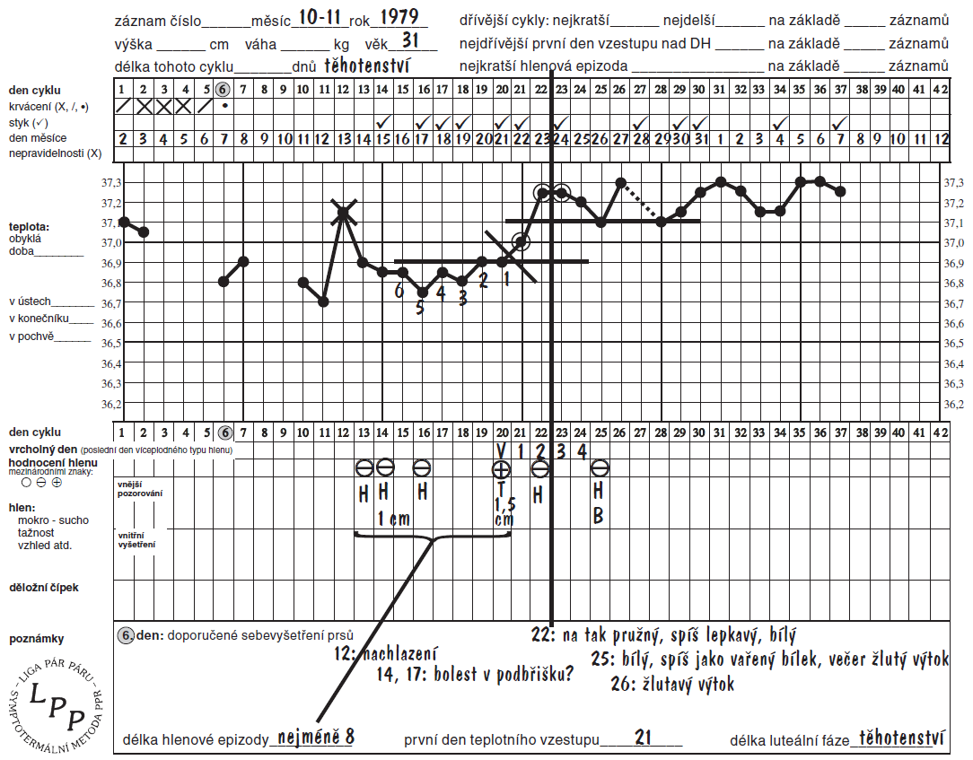 Na začátku cyklu chybí záznamy teplot i hlenu. Při předcházení početí by byly takové záznamy důležité, aby mohli manželé určit začátek plodné doby. Pro dosažení početí však nejsou tak významné. Je nápadné, že na začátku cyklu neměli 13 dní styk. Možná byl manžel na služební cestě, anebo se šetřili, aby měli víc síly pro intenzivnější manželský život právě v nejplodnější části cyklu.